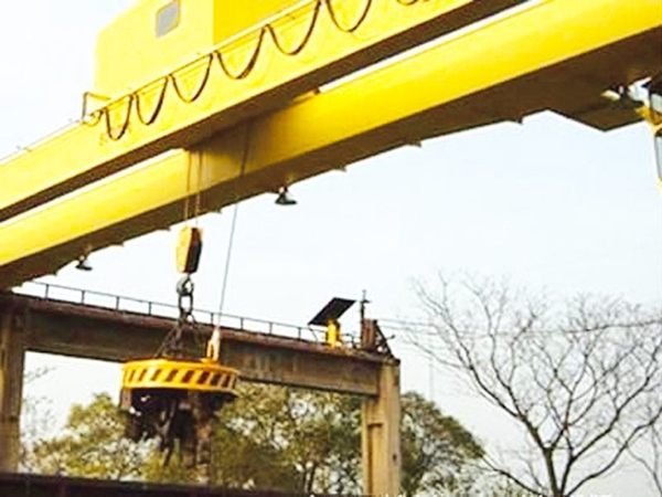 電磁橋式起重機的基本構(gòu)造與吊鉤橋式起重機相同,不同的是吊鉤上掛1個直流起重電磁吸盤,用來吊運具有導(dǎo)磁性的黑色金屬及其制品。通過裝在司機室內(nèi)的可控硅直流箱將交流電源轉(zhuǎn)換為直流電源,然后再通過設(shè)在小車上的專用電纜卷筒,將直流電源用電纜送到電磁吸盤上。